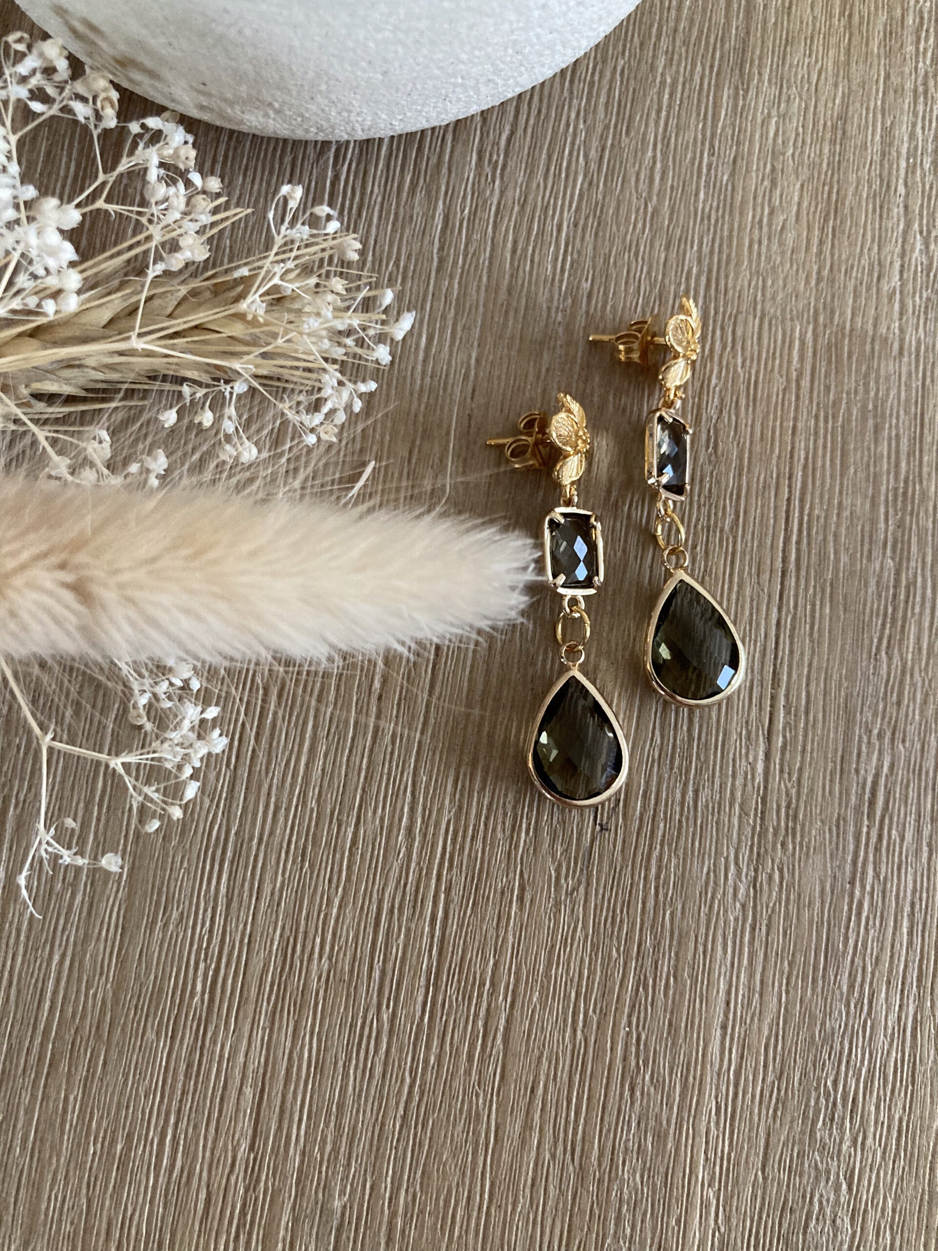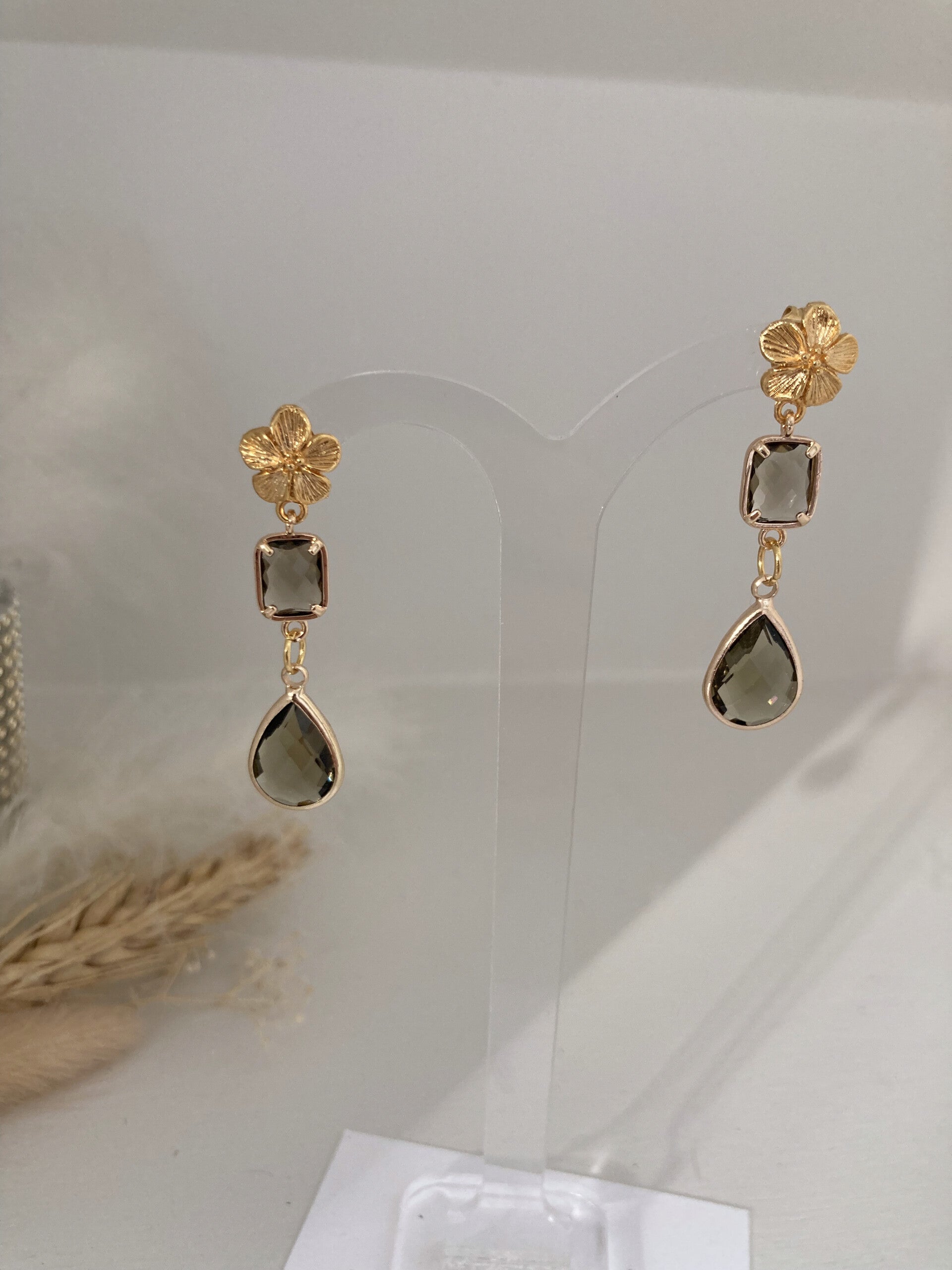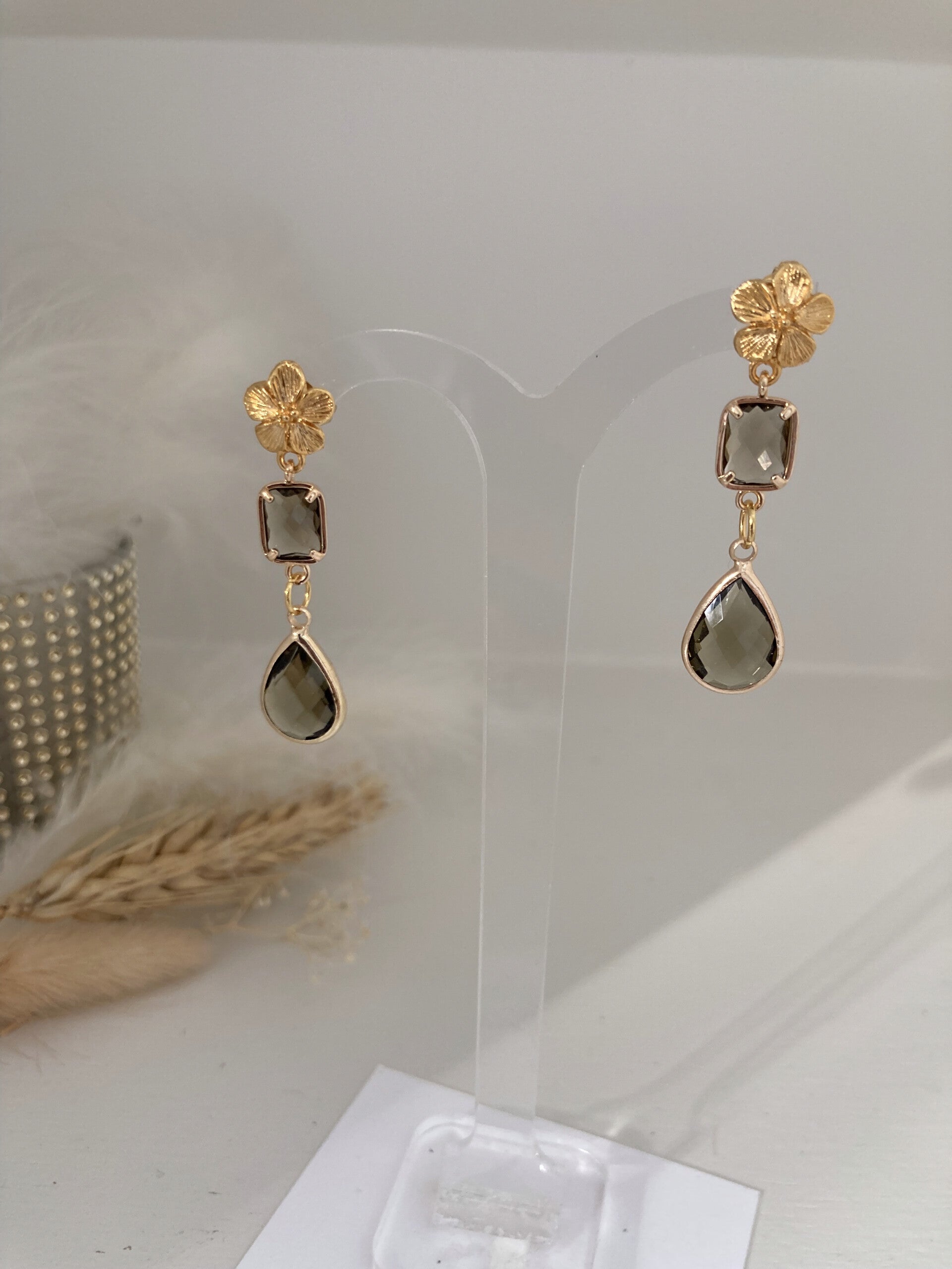 Afgewerkt met een goudkleurige, mooie oorsteker gemaakt in Italië en een greige crystal hanger als midden - en onderstuk.