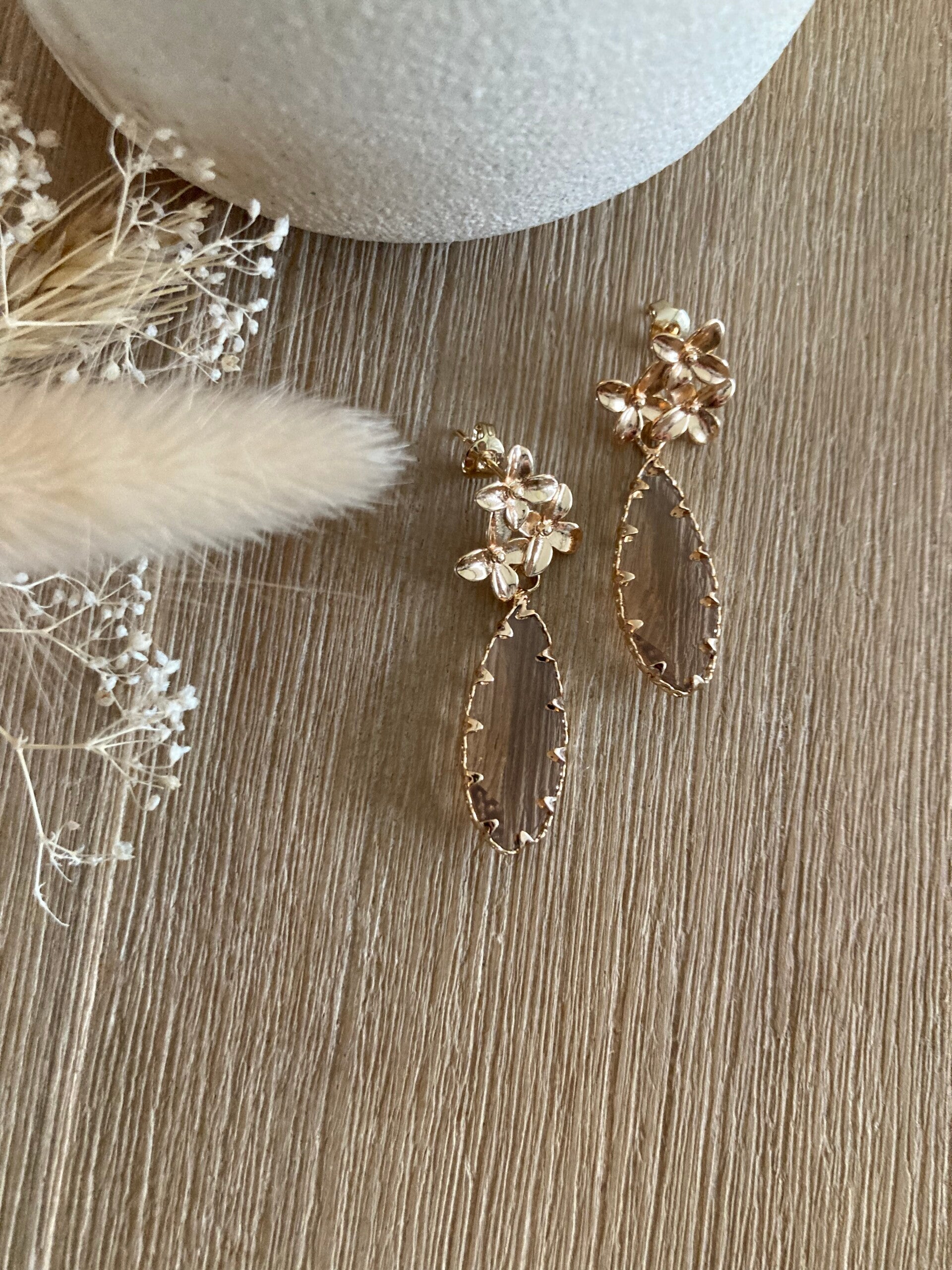 Wanneer je de oorbellen draagt, dan zullen ze lichter zijn van kleur, de crystal hanger heeft dan geen bruine achtergrond.